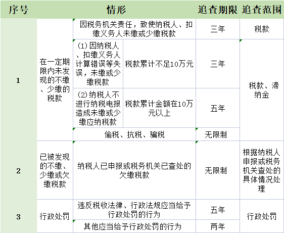 根據規定,納稅人(rén)存在偷稅、抗稅、騙稅情形的(de),是(shì)會(huì)無限期追查的(de)!具體(tǐ$)看(kàn)表: