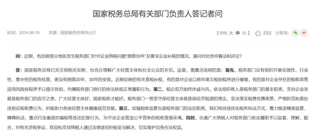 問(wèn):近(jìn)期,有(yǒu)反映部分(fēn)地(dì)區(qū)發生(shēng)稅務部門(mén)針對(duì)企業(yè)納稅問(wèn)題₩“倒查30年(nián)”及要(yào)求企業(yè)補稅的(de)情況。請(qǐng)問(wèn)對(d$uì)此有(yǒu)何看(kàn)法和(hé)評論?